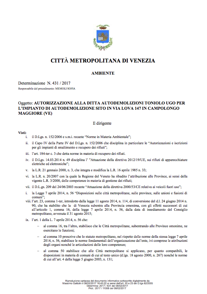 AUTODEMOLIZIONI TONIOLO è autorizzata dalla provincia di Venezia nella gestione e demolizione dei veicoli fuori uso, oltre che allo smaltimento di ciò che contengono.