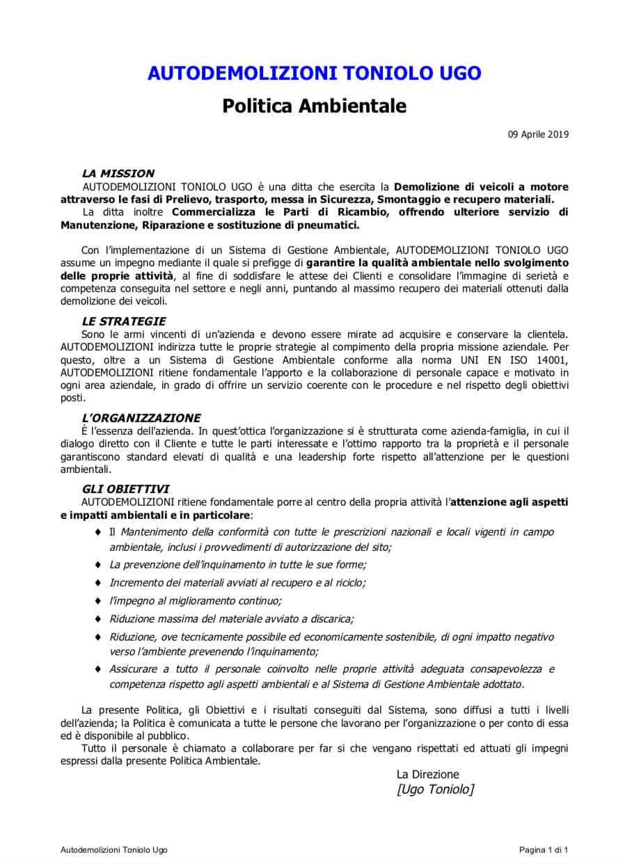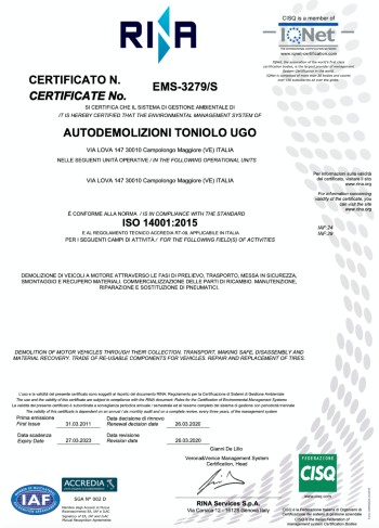 Inoltre AUTODEMOLIZIONI TONIOLO è in possesso della Certificazione ISO 14001:2015 rilasciata dall’ente certificatore. La certificazione è stata resa possibile tramite l’uso di un Sistema Gestionale Ambientale interno tenuto giornalmente sotto controllo dal Responsabile Ambientale della ditta.